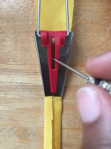 The awl helps guide strips through. This tool was not included in this set of bias tape makers, so I made one with a doll needle and cutoff seam.