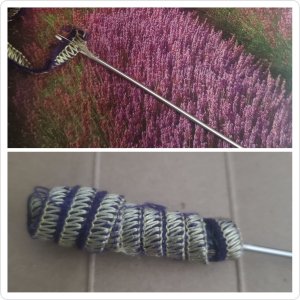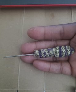 I started with just enough going through the eye of the needle. Then used E6000 glue on the seam and wrapped and glue it around for my handle. This glue needed to dry overnight and voila!